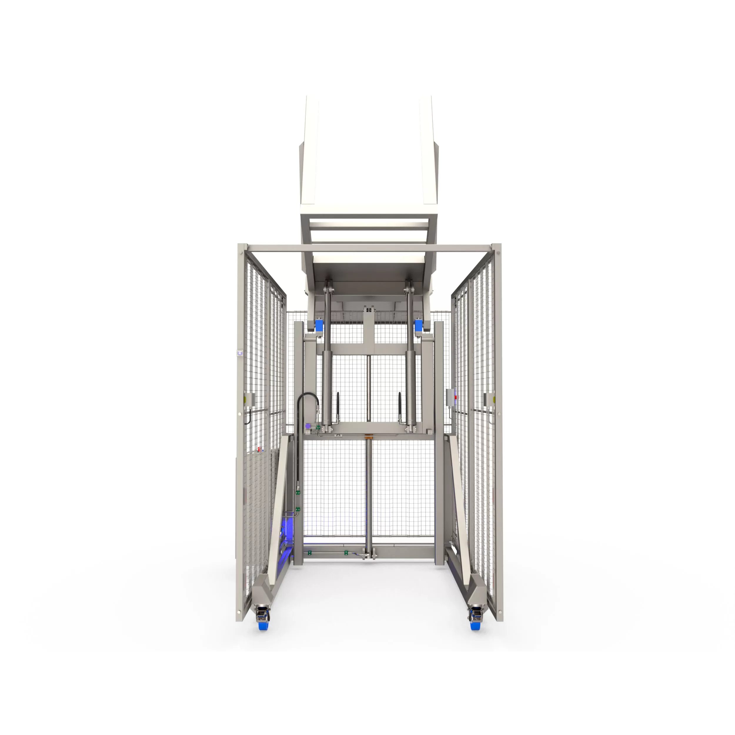 Спиносберегающий подъемник-опрокидыватель типа ГПО марки «STEELPRO» предназначен для загрузки технологического оборудования, в т.ч. посолочных барабанов (тумблеров), шприцев (инъекторов), бункеров-накопителей и высоких ленточных конвейеров. Машина оборудована фирменным подъемно-опрокидывающим механизмом «ван Оршрот» для удобства и безопасности работы с крупногабаритными и нестандартными контейнерами, восьмиугольными гофрокоробами, пластмассовыми ящичными поддонами, деревянными ящиками или картонными коробками на поддонах. Благодаря своим двум или трем гидроцилиндрам, отсутствию цепной передачи и компактным размерам машина отличается высокой производительностью и требует минимума техобслуживания.