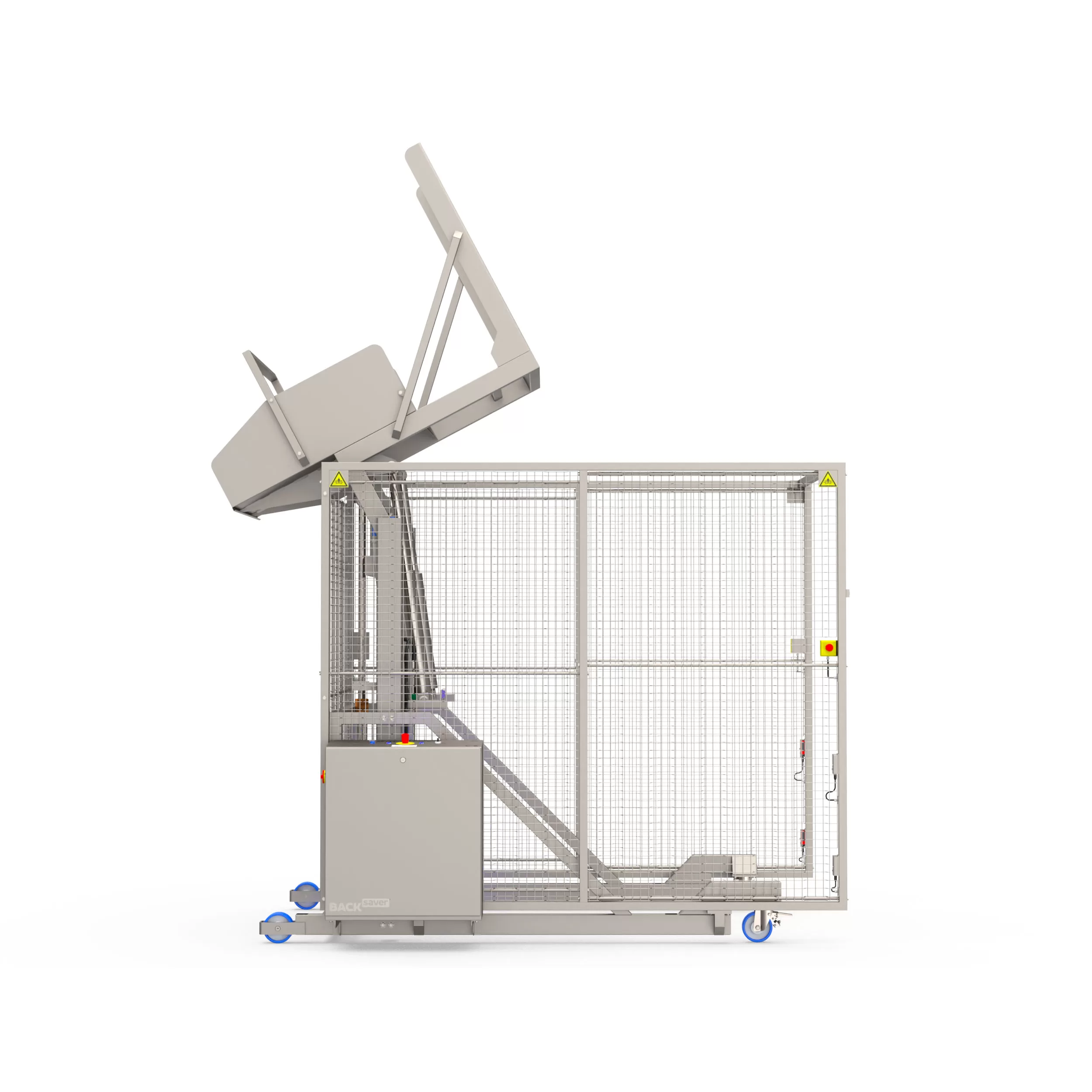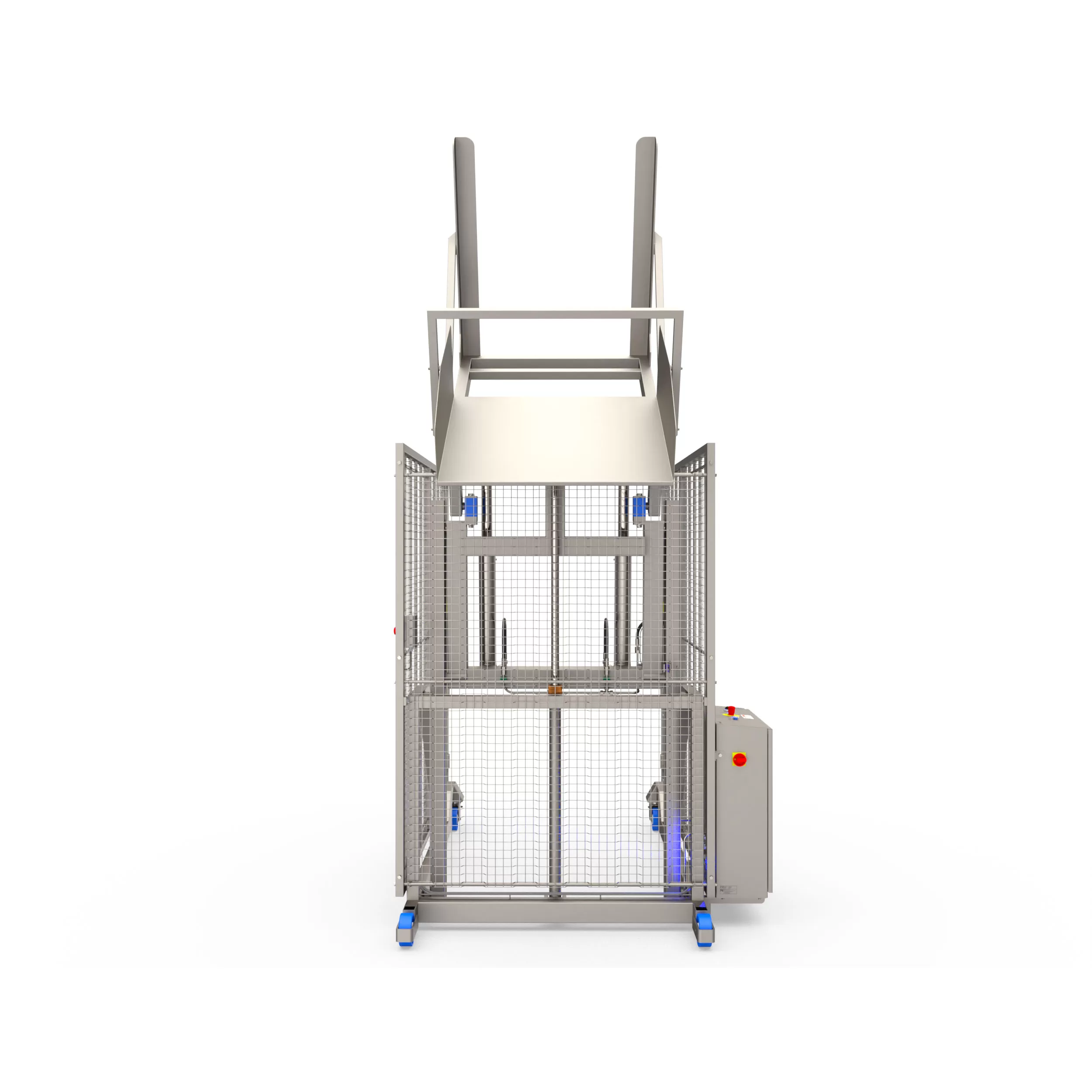 Данную машину устанавливают стационарно в местах, специально отведенных для разгрузочных работ. Поддон с картонной коробкой или ящиком заряжают в подъемник при помощи гидравлической тележки или вилочного погрузчика, а затем плавно поднимают на требуемую высоту. Необходимость поднимать грузы вручную, нагибаться и наклоняться отпадает, риск возникновения болей в пояснице, растяжения мышц спины или получения производственных травм уменьшается. Здоровый рабочий доволен, работоспособен и повышает производительность труда. По требованию машина также может быть изготовлена для работы в автоматическом режиме.