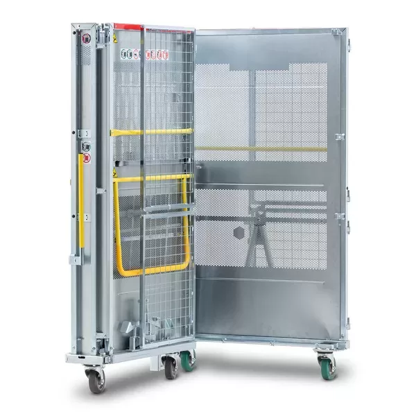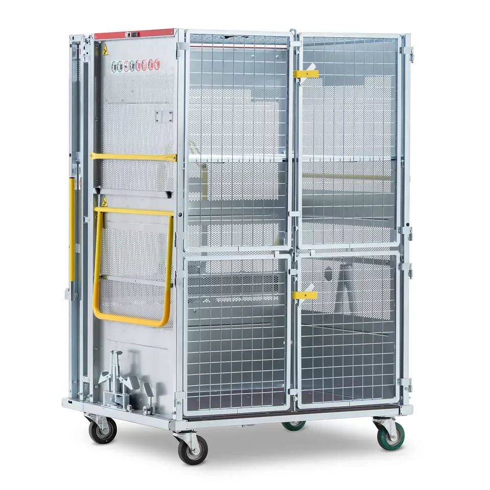 Конструкция с решетчатыми дверями с двумя или четырьмя створками на металлических петлях. Угол поворота 270°. Блокировочный механизм можно дополнить навесным замком для предотвращения краж. Крышка из проволочной решетки откидывается вверх или вниз.