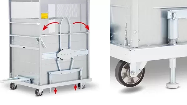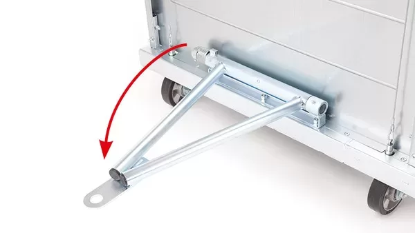 При задействовании стопорного устройства выдвигаются две ножки, предотвращающие откат контейнера. Оптимизирован под погрузочные платформы грузовых автомобилей.