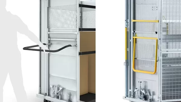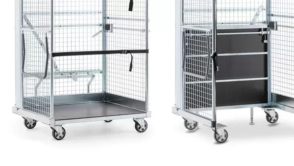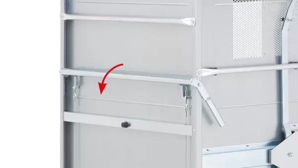Нижняя полка откидывается вверх, одна боковая часть складывается внутрь (L-образная форма). Таким образом несколько контейнеров можно задвинуть друг в друга