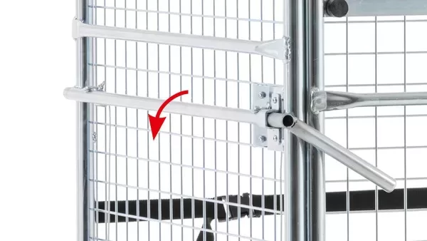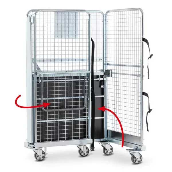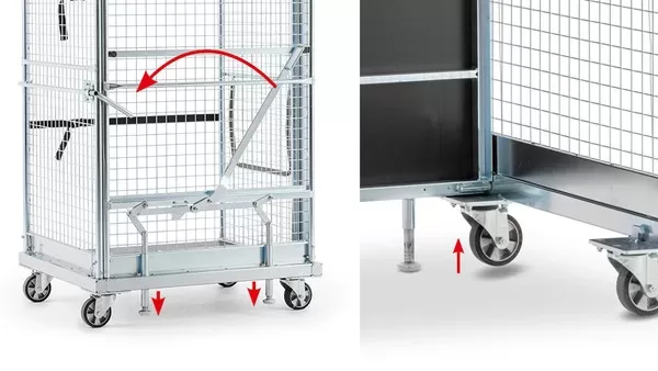 Нижняя полка откидывается вверх, одна боковая часть складывается внутрь (L-образная форма). Таким образом несколько контейнеров складываются друг в друга.