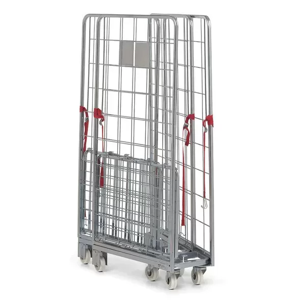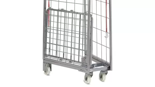 Проволочное дно навешивается на боковые части и легко откидывается вверх. Теперь боковые части могут свободно поворачиваться. При этом они задвигаются на А-образную нижнюю раму и тем самым позволяют задвигать контейнеры на колесах друг в друга.