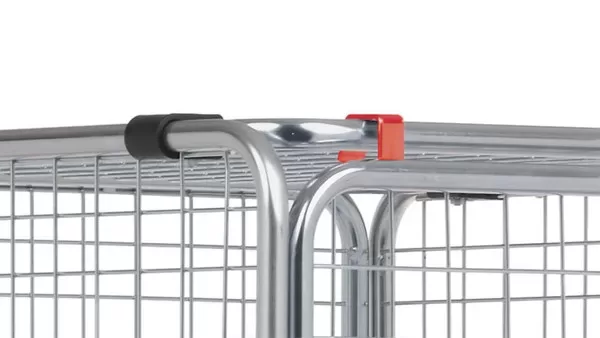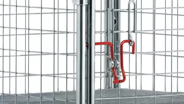 Нижняя рама из пластика с широкой платформой. Конструкция контейнера включает в себя раму из трубы круглого сечения, проволочную сетку и встроенные фиксирующие скобы. Дверь с пластиковым шарниром. Угол открывания 270º.