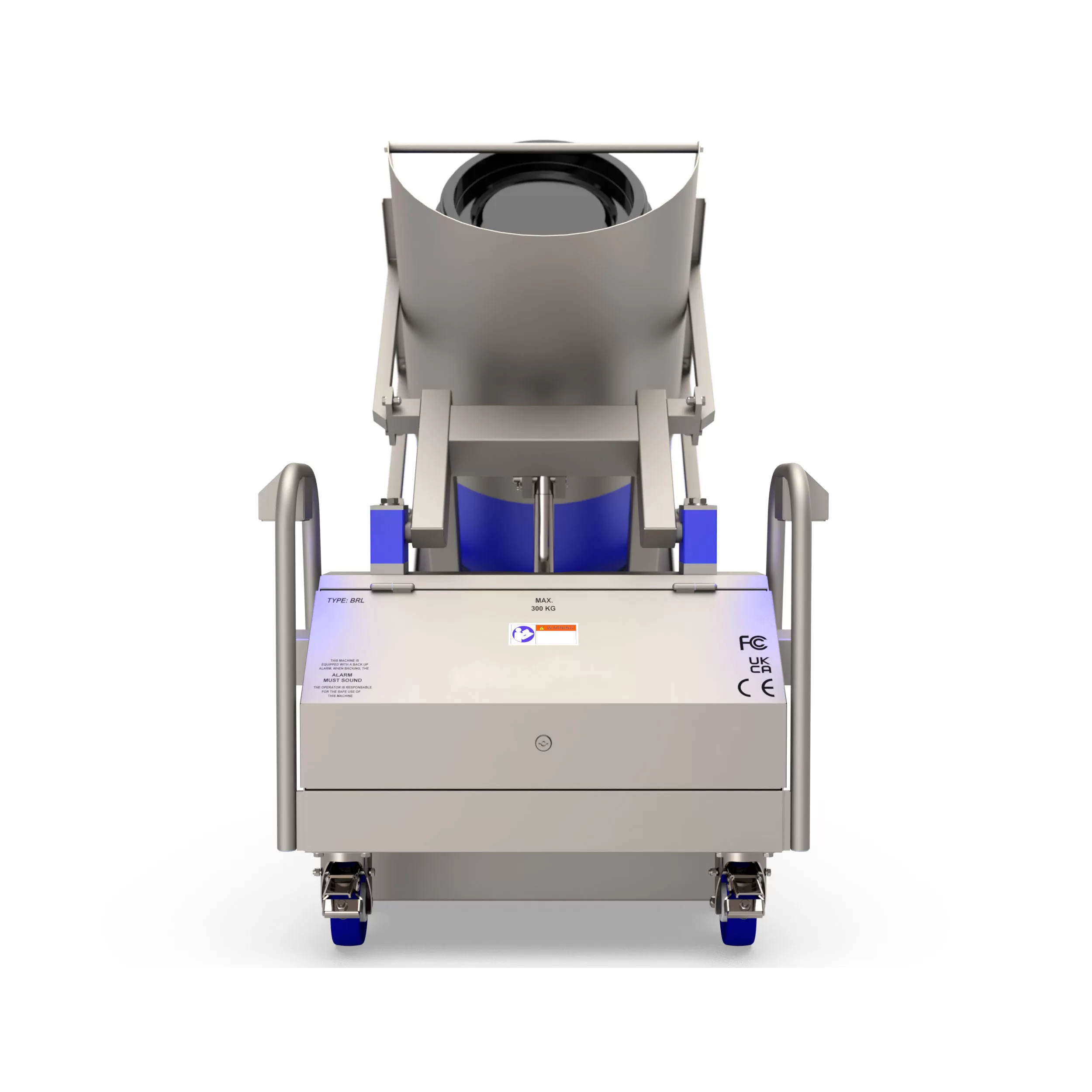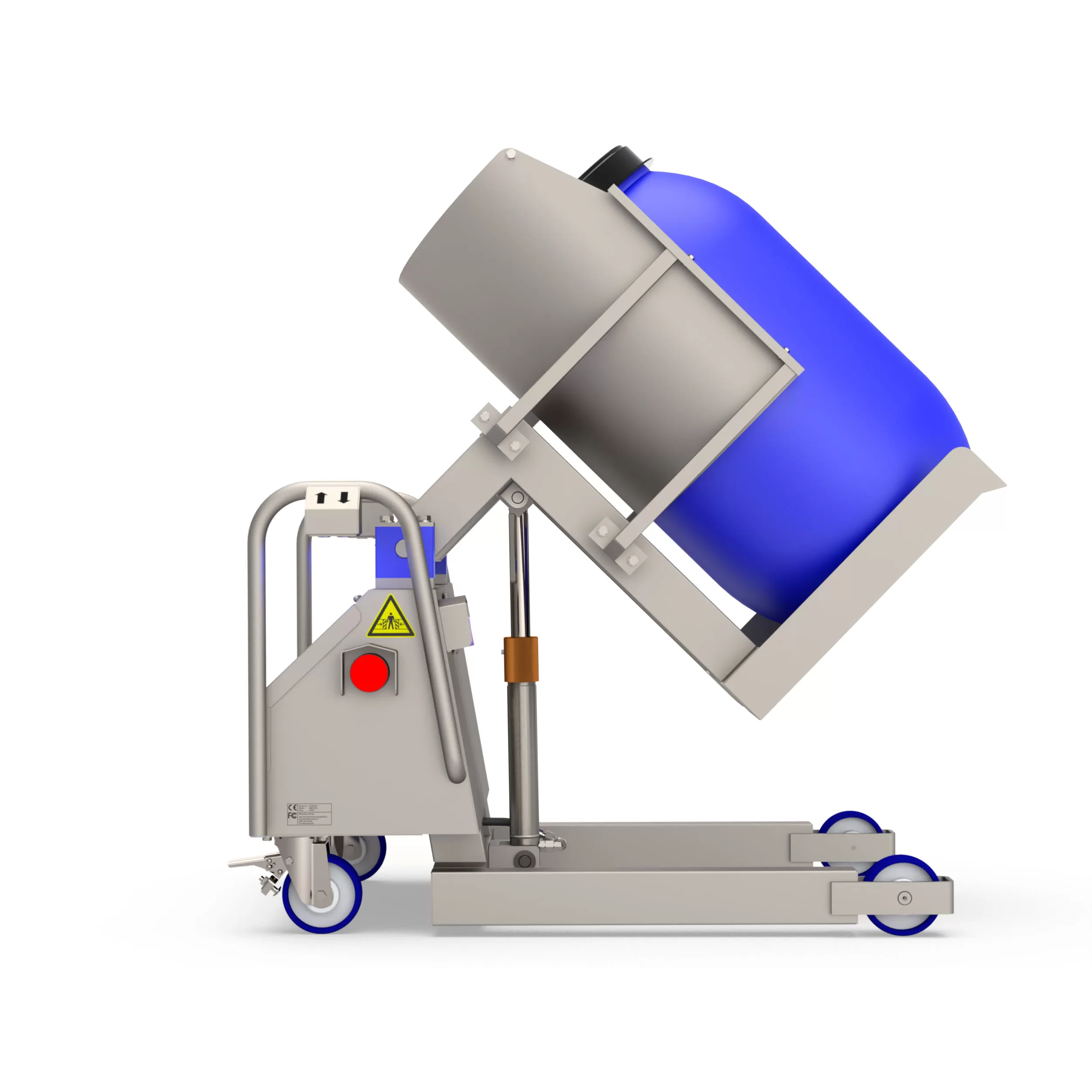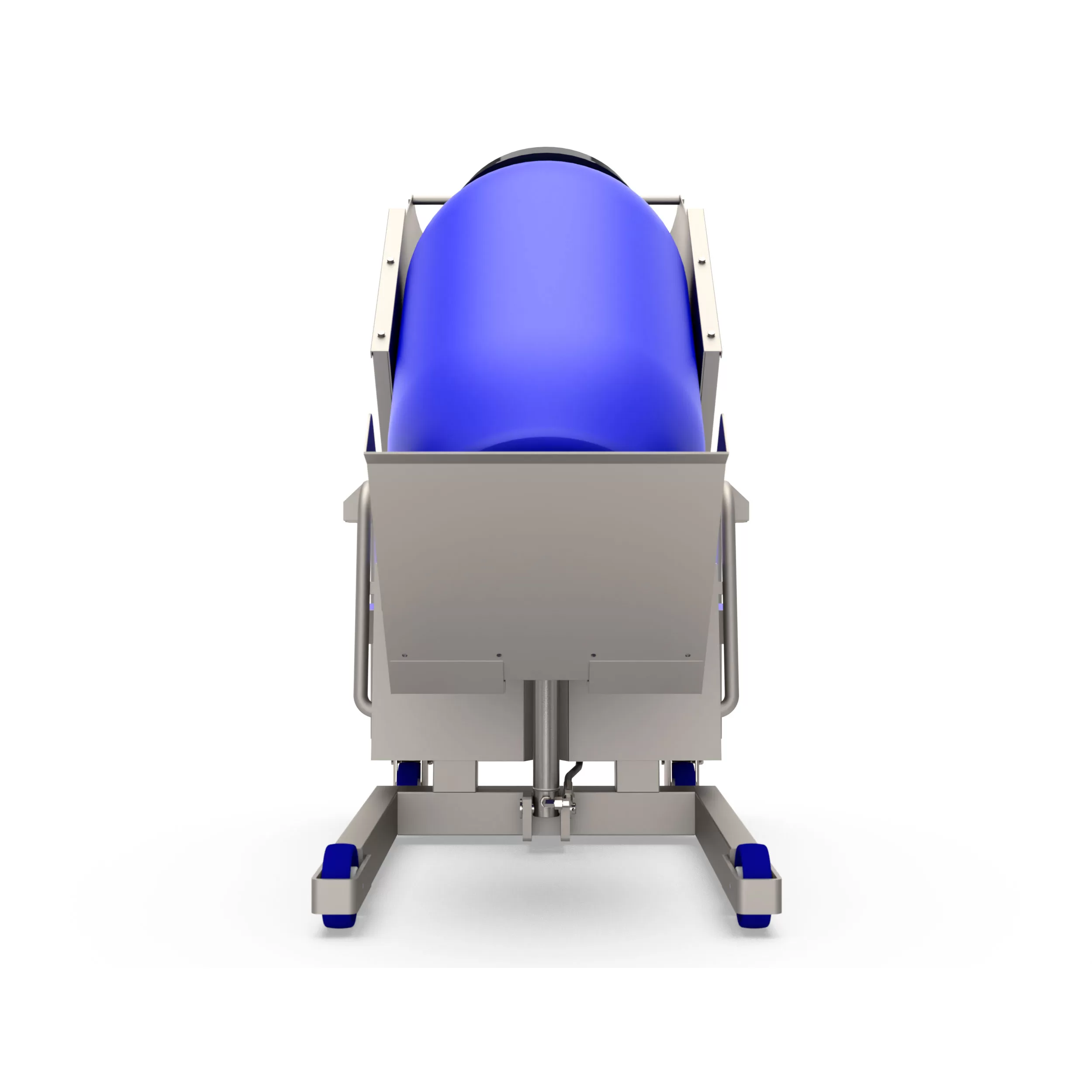 Бочку с продукцией (кишечное сырье, фрукты, овощи, соленья, соусы, маринады или прочие пищевые продукты) загружают на платформу опрокидывателя, перемещают в место выгрузки, плавно переводят в удобное для выгрузки положение либо наклоняют до установленного максимального угла. Необходимость поднимать грузы вручную, нагибаться и наклоняться отпадает, риск возникновения болей в пояснице, растяжения мышц спины или получения производственных травм уменьшается. Здоровый рабочий доволен, работоспособен и повышает производительность труда.