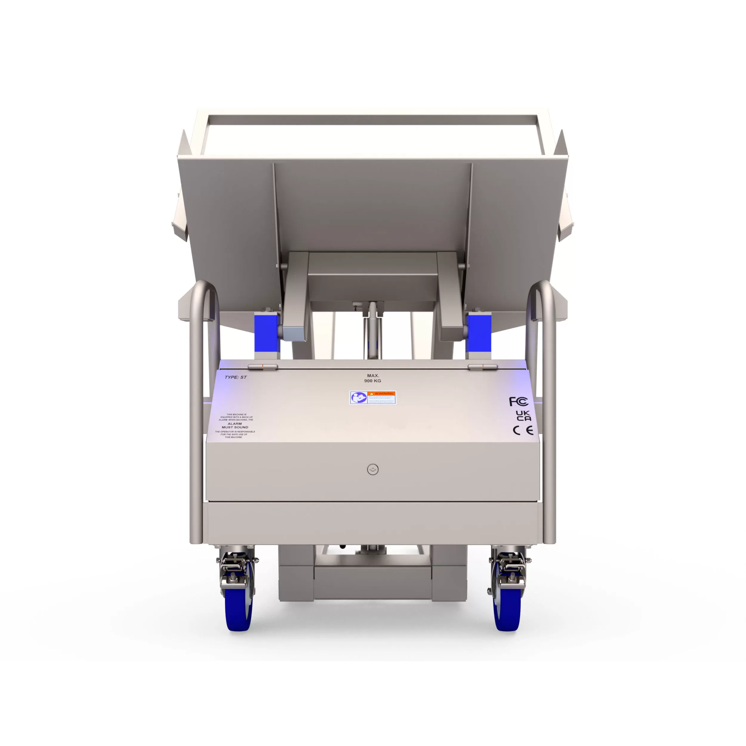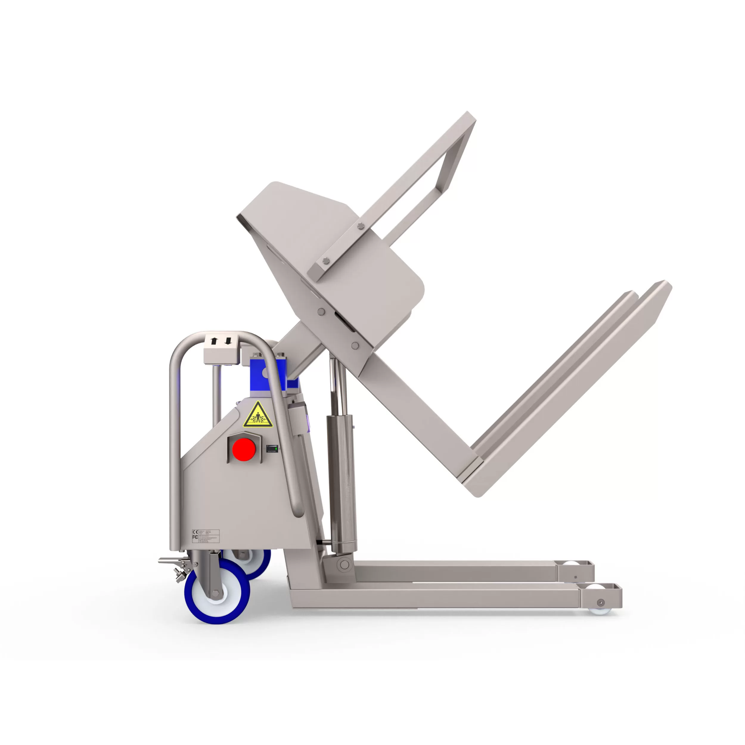 Благодаря паре вынесенных за раму машины износостойких поворотных колес с тормозом максимальный угол наклона может быть увеличен до 110 град. без ущерба для безопасности и устойчивости. Подъем груза производится гидравлическим цилиндром с обратным ходом под действием силы тяжести, что значительно уменьшает риск травматизма вследствие попадания под подвижную часть машины. Для максимальной безопасности и оповещения окружающих о находящихся в движении рабочих органах машина дополнительно укомплектована звуковой предупредительной сигнализацией.