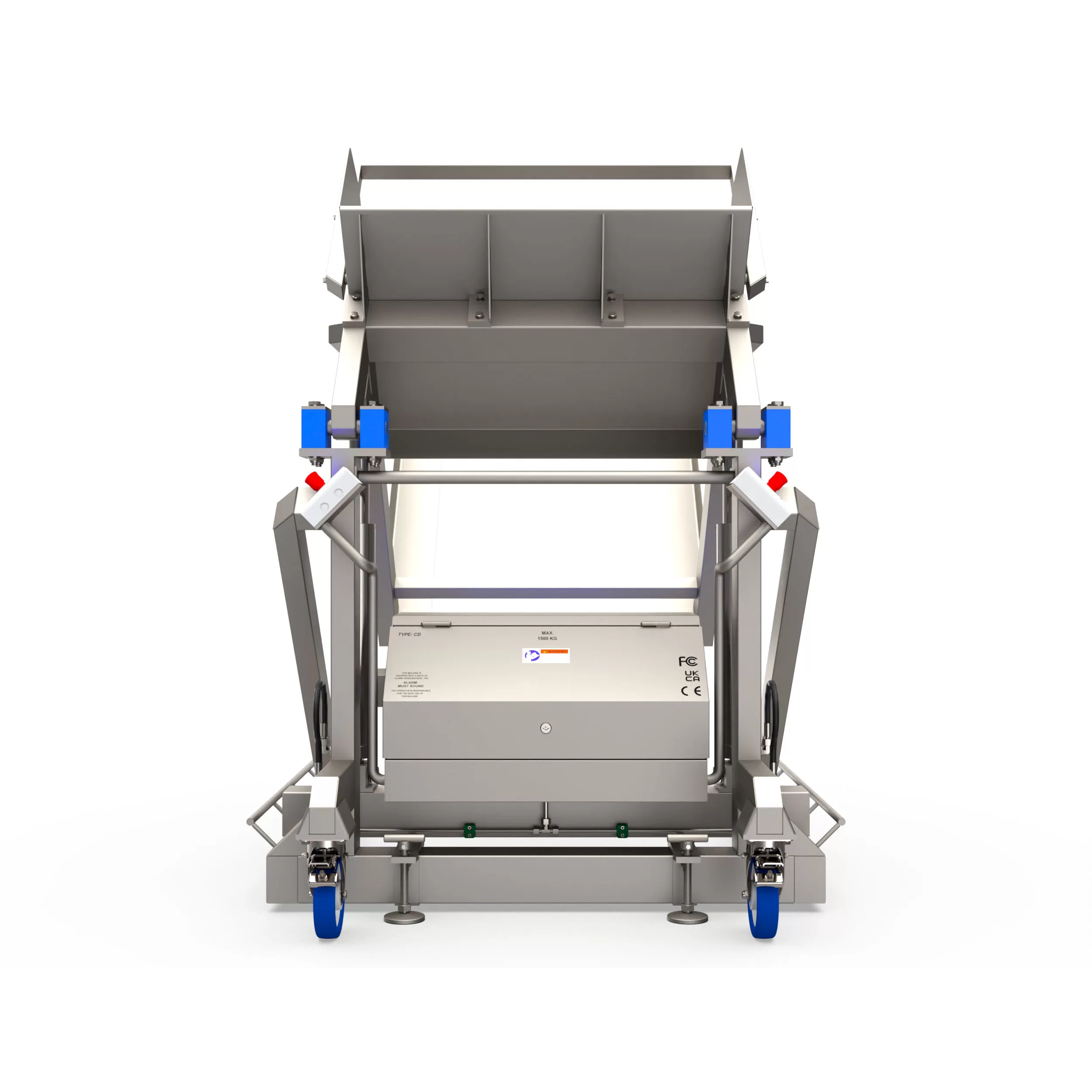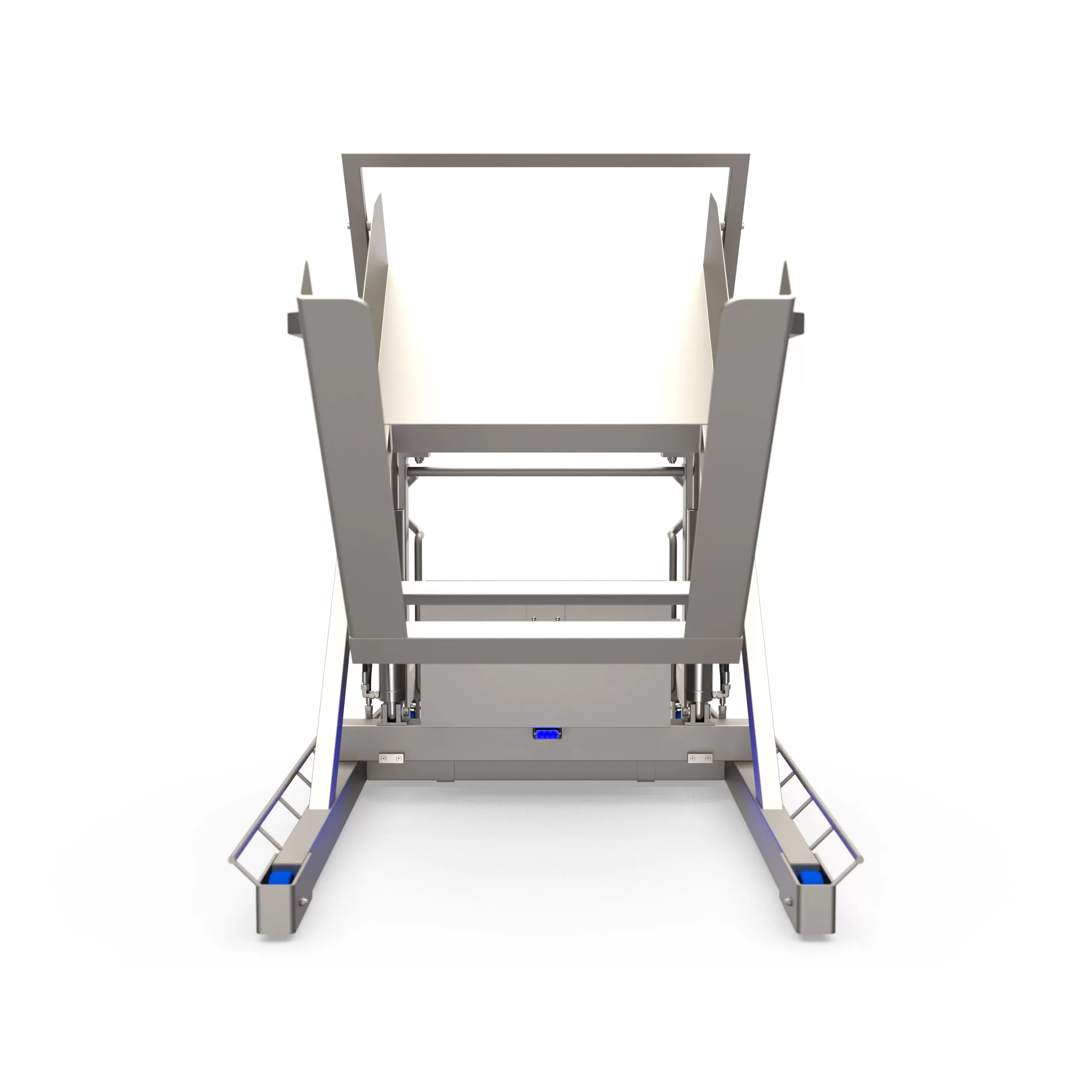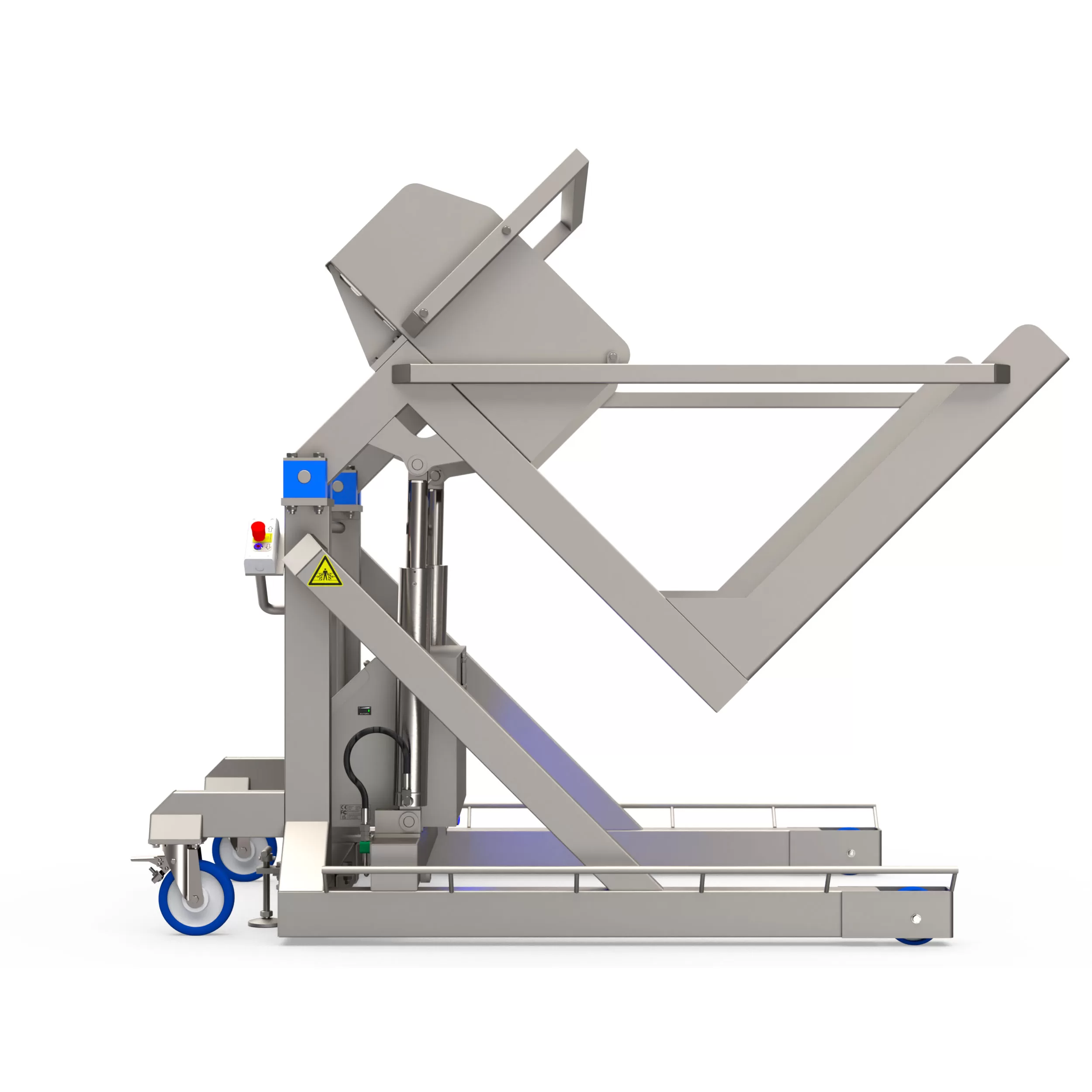 Данные машины устанавливают в специально отведенных местах для разгрузочных работ и перемещают только при необходимости. Контейнер с продукцией (мясо, рыба, овощи, фрукты и т.п.) доставляют к опрокидывателю и заряжают при помощи гидравлической тележки или вилочного погрузчика, затем плавно переводят в удобное для выгрузки положение или наклоняют до установленного максимального угла. Необходимость поднимать грузы вручную, нагибаться и наклоняться отпадает, риск возникновения болей в пояснице, растяжения мышц спины или получения производственных травм уменьшается. Здоровый рабочий доволен, работоспособен и повышает производительность труда.