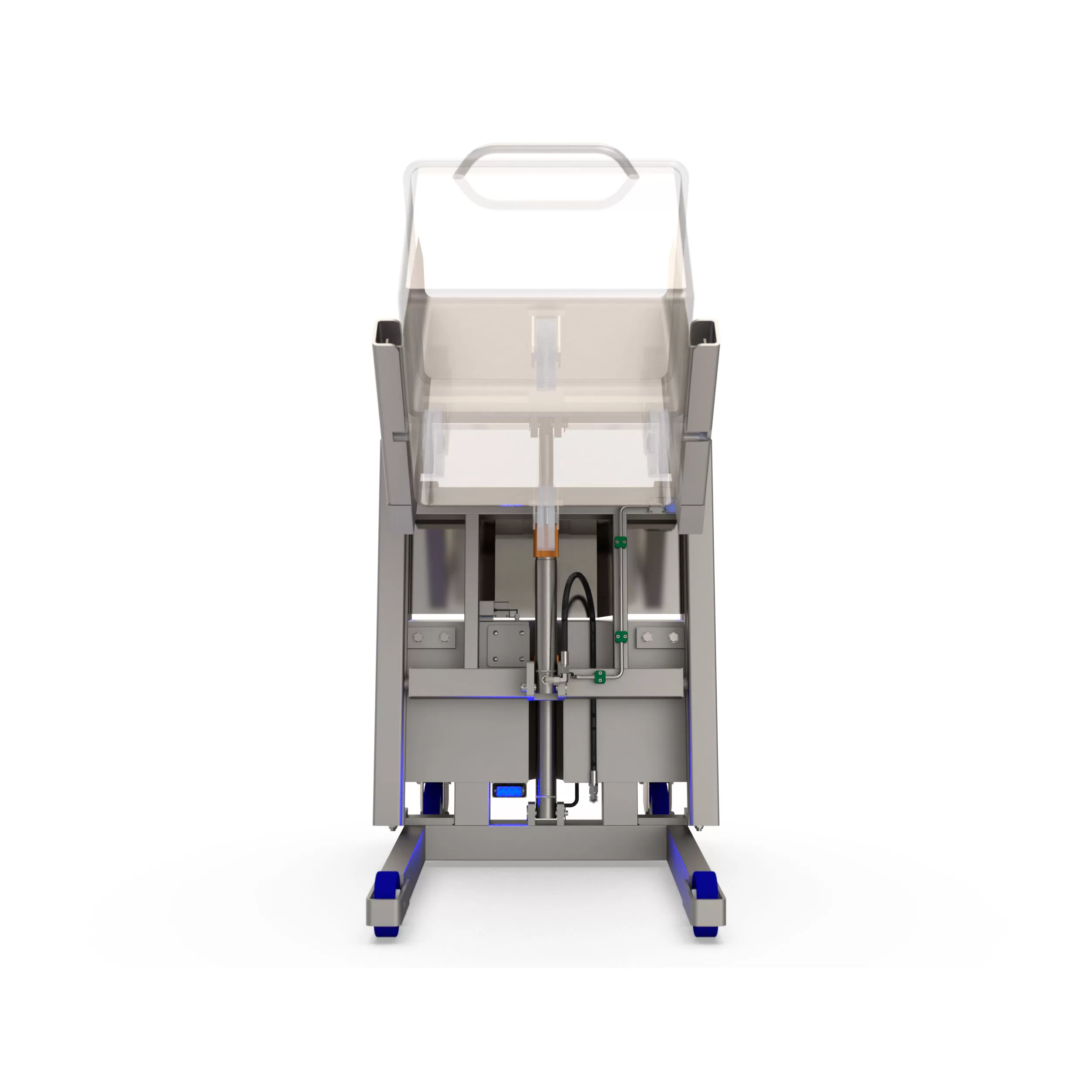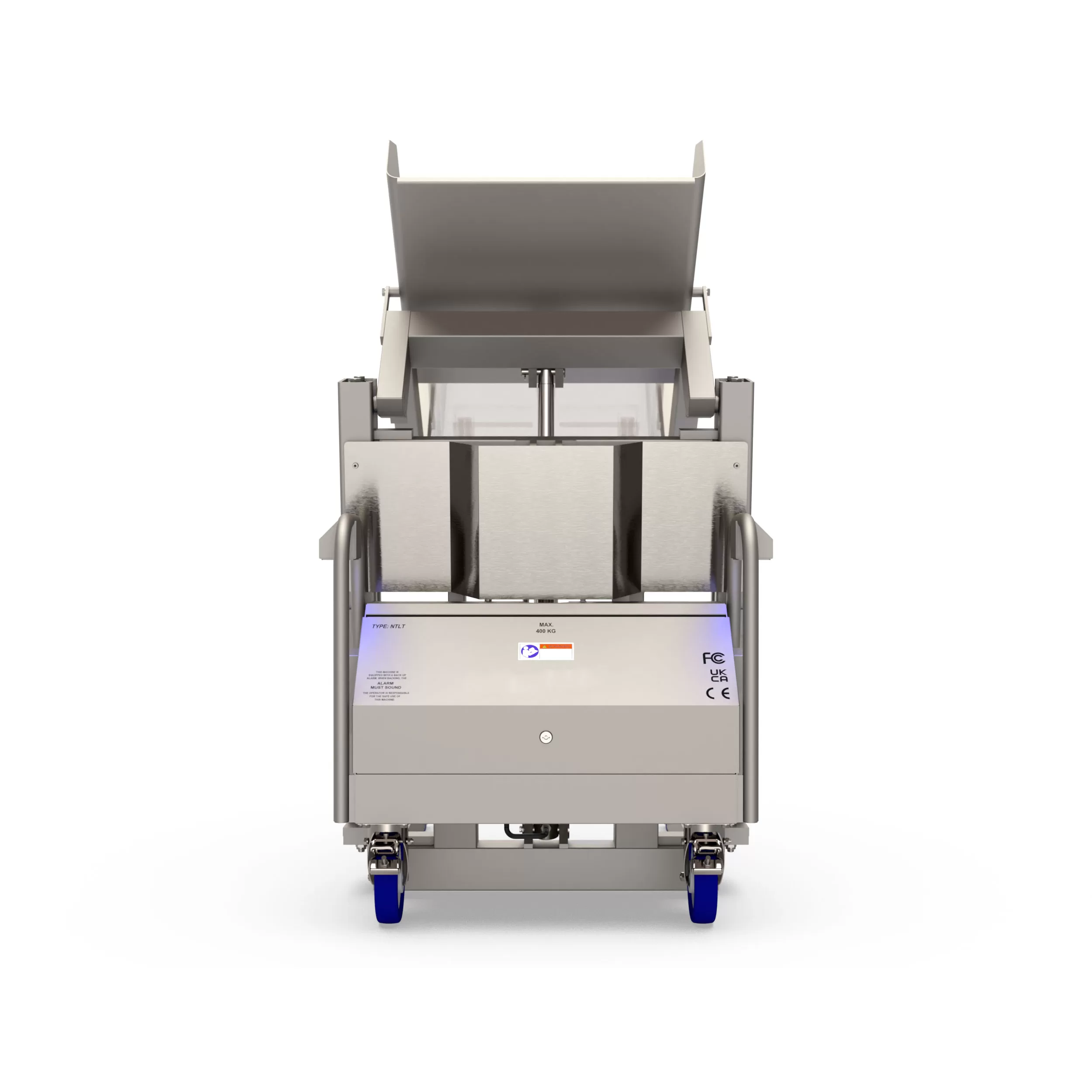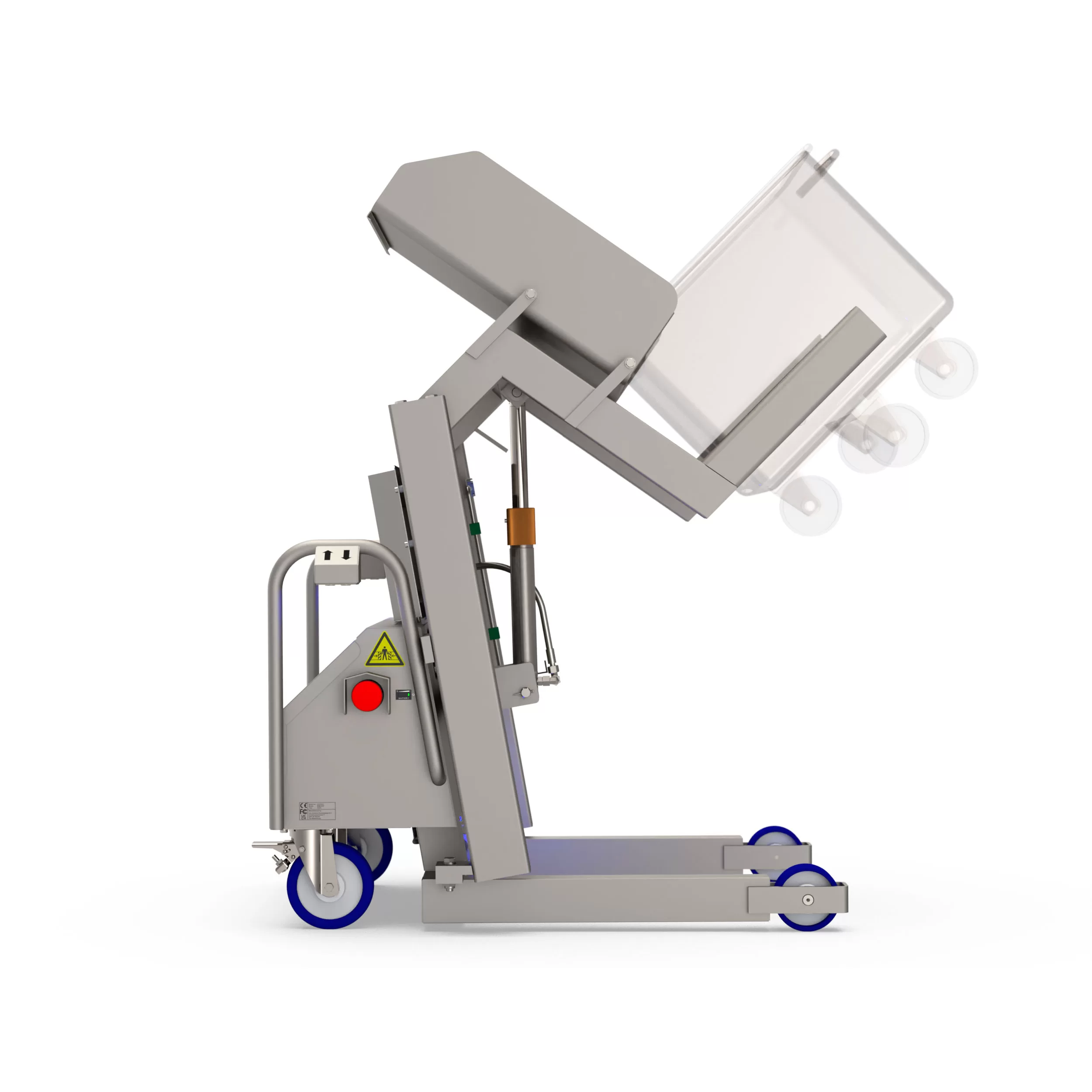 «STEELPRO» предлагает простые и удобные средства механизации подъемно-транспортных работ для повышения эффективности производства и уменьшения риска производственных травм. Продублированные с обеих сторон органы управления остаются в пределах досягаемости рукой вне зависимости от фактического положения машины, которая подойдет для выгрузки продукции как на стол или в технологическую линию, так и на уровне рабочей платформы. Данную машину можно встраивать в технологические линии для выгрузки содержимого тележек-чанов на ленточные конвейеры или в приемные бункеры-накопители винтовых конвейеров, а также использовать для загрузки сырья в волчки, прессы механической обвалки, дообвалки и жиловки, посолочные барабаны (тумблеры), куттеры, шприцы (инъекторы) и фасовочно-упаковочное оборудование.