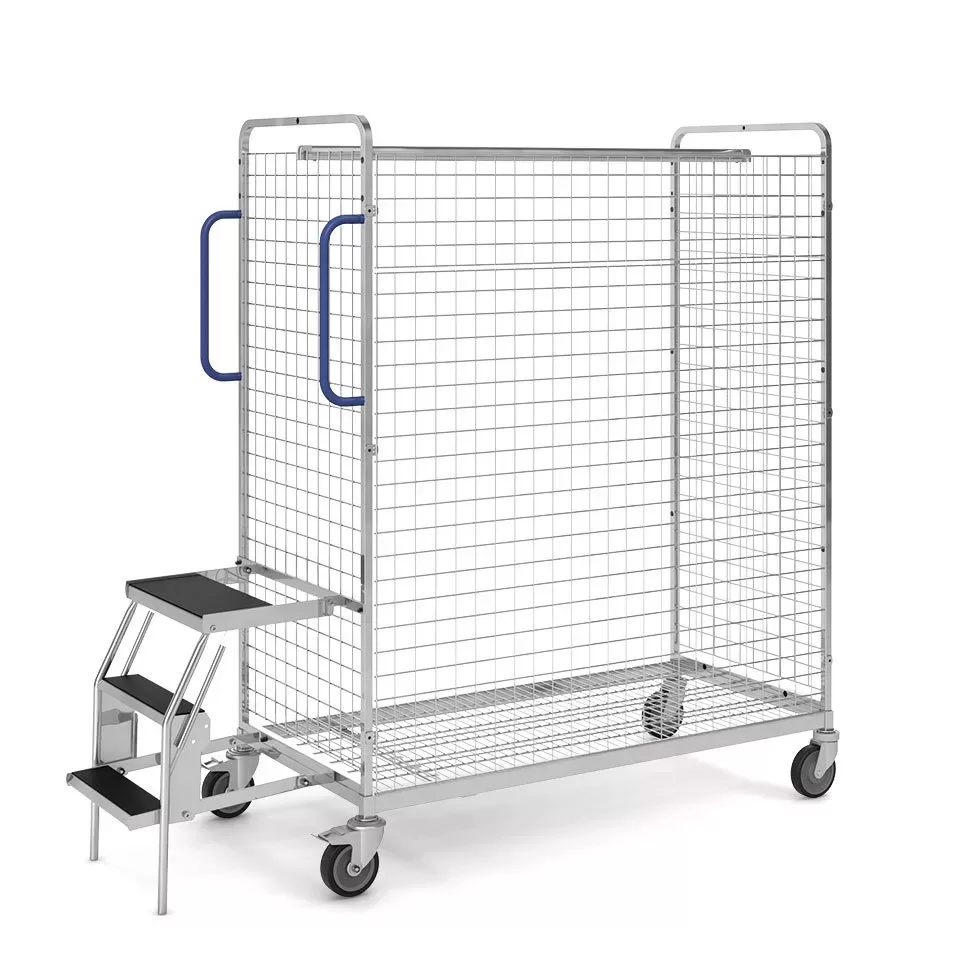 Нижняя рама из трубы прямоугольного сечения с приваренной проволочной платформой. Боковые детали рамы из трубы прямоугольного сечения с металлической сеткой, вставлены в нижнюю раму и привинчены. Задняя стенка из проволочной решетки, привинчена к боковым частям. Навешиваемая перекладина для одежды из трубы плоскоовального сечения. Ручка для толкания из стальной трубы в пластиковой оболочке синего или красного цвета. Откидная стремянка с нескользящей поверхностью из рифленой резины.