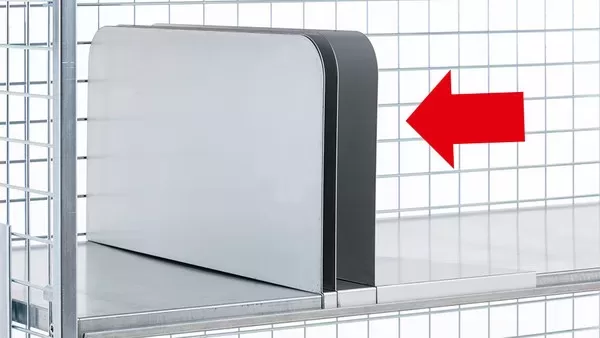 Разделители из листового металла можно передвигать в зависимости от объема заказа или складывать друг на друга. Их можно также произвольно распределять по полкам. Направляющая шина не позволяет разделителям выпасть с полки.