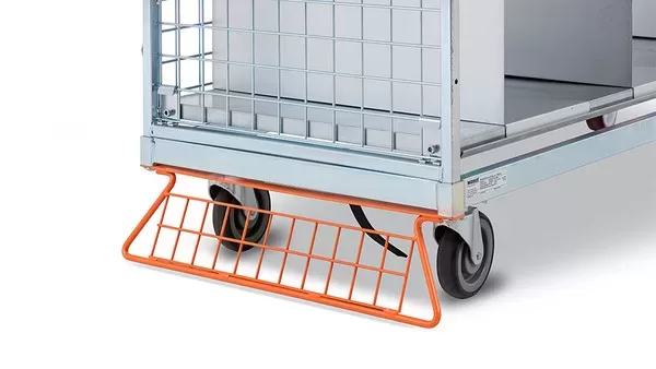 Металлическая решетка перед колесами под ручкой для толкания защищает ноги при перемещении тележки за собой.