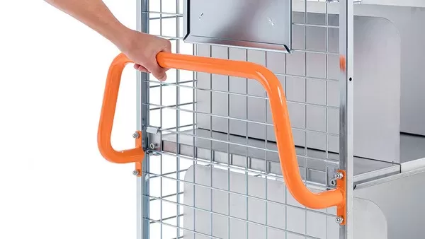 Конструкцией ручки для толкания предусмотрена регулировка по высоте в зависимости от роста сотрудника. Боковые части ручки наклонены к центру, так что пальцы рук не выступают по бокам тележки, что исключает риск их травмирования.